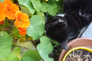 So I am very, very quiet and watch mama looking everywhere (and there’s not much in the garden right now to look under or over except the feves) and when she gets closer I yell “WARM” and when she goes in the opposite direction I whisper “cool” and then she turns around and FINALLY (duh) sees me snuggled into the nasturtiums under the broad beans and she says, “LOULOU, you gave me a start, hiding in there and then jumping out, grinning uncontrollably! What on earth has gotten INTO you?”