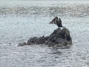 The bane of all fishermen, this amazing diver can plunge in to catch a fish and come up many yards/meters away in a very few seconds. So when mama saw this guy taking a bath on his rock, unmoving, she called out to him, “Hey, Mr. Cormorant, do you mind posing for me?”