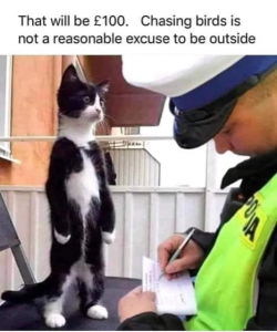 What? Chasing birds is a purrrrfectly reasonable reason to be outside! That’s a pretty stiff penalty too – how many kitties do I know who have a hundred pounds????? NONE!!!!!!