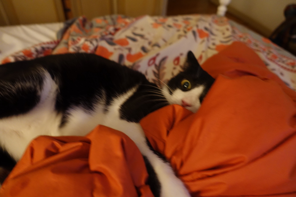 I LOVE my feather-filled snuggle comforters, and am thankful for them, and thankful for all the shelters that are taking care of winter’s kitties (and doggies, of course) with no homes, and thankful for Brian’s hop, and thankful for wonderful new laws in the USA for couples of any kind, and thankful that our xmas lights are still working a year later (!) and thankful that my back legs are getting treatment, and thankful that so many anthros on the earth are working on how to save our planet, however-which-a-way they have do it.