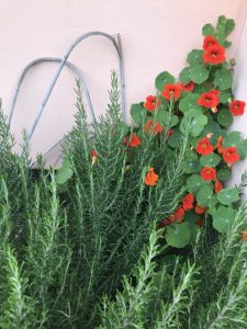 This little corner of our rosemary surprised us when the nasturtiums started peeking out and climbing the wall!
