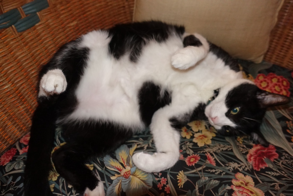 On your back for a belly rub! This is rare for a cat, only our Mikey used to let us do that.