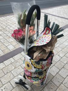 Well, I just had to snap a pic of mama’s new shopping cart, which she finally found after searching a gazillion websites. It was not easy because she wanted a small six-wheeler! And pretty besides, which this is. It is also plastic oil cloth, like those tablecloths that mama’s grandma and mama had long ago but easy to clean!