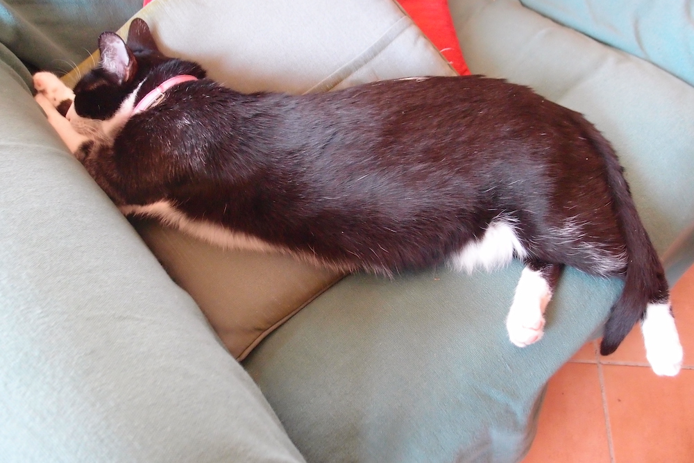 We can never figure out why cats drape themselves all over the place when napping, Loulou.