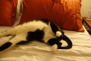Not every anthro would drool at the thought of liver, LouLou. Or cauliflower or broccoli. But it is thoughtful of you to be careful of Mama’s bed.