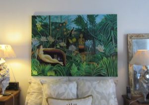 Along with Mya’s maman, who painted this Rousseau to include Mya and me, and it has the lovely colors, too, of a peacock! The kitty upstairs who lost his eye now has his eye back in place, thank you for being concerned.