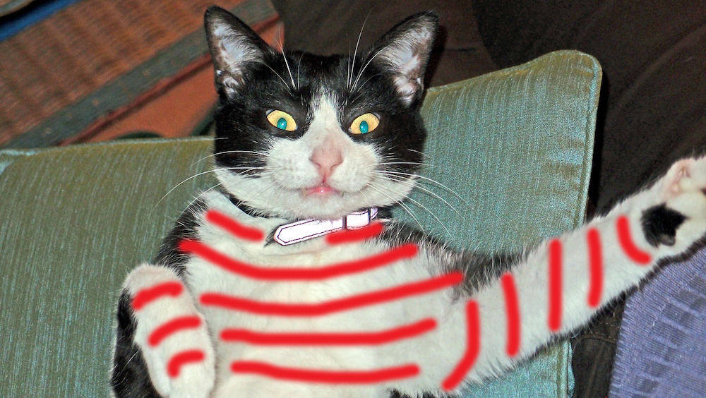 I AM NOT WEARING THIS, NO WAY, JOSE! So mama just decorated me herself. I guess you could call this WEIRD suit Caturday Art…