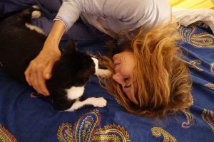 I only came down to get cuddles and I saw and heard mama try to ride herd on the guests about an hour before they finally left, but what can a kitty do?  Finally, papa picked up some plates and stacked them and that was the signal to scoot!  I caught mama looking grateful, haha…