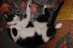 Loulou, is that your nip toy behind your back?! We missed you last night – your mama and papa came over and gave ME a tiny tomato from your garden (from you). MERCI. I sent back a couple of things for YOU – and YIPPEE – we’re getting back together tonight. All will be good – hope you’re having fun and being spoiled by Kitty Whisperer!!!