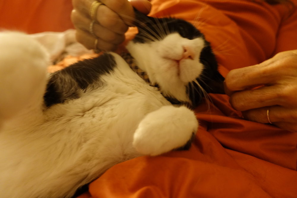 Wow, many kitties HATE having their ears or paws touched but we know better, right? It’s probably genetic in my case. Mama and papa LOVE massage. And I love my back paws held sweetly. And yes, there are rumors about P’s health. And in his speech yesterday he did NOT mention more agression….but every bully needs a way to save face without more harm to others, as mama’s solution does not always work: A quick slap on the nose! Sometimes diplomacy has to be used so that the horrible autocrat thinks he has gained something and will not PUSH A BUTTON.