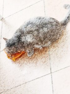 That pencil sketch looks like a picture taken through a screen door or maybe a window of a kitty on a porch in the rain. Rasta may take to his house in time, once he is sure it won’t shut him in.