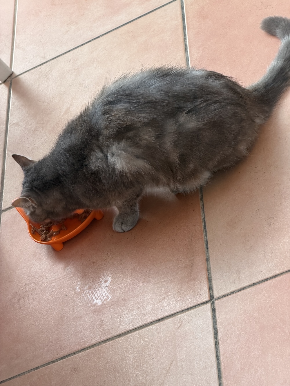 Here’s another a bit more sane, haha. A REAL kittie, eating real food just after mama put the flea pipette juice between his ears. Such a sweetie, but he doesn’t seeem to want his little protective “house”. Maybe when it rains tomorrow he’ll be looking for a hotel!