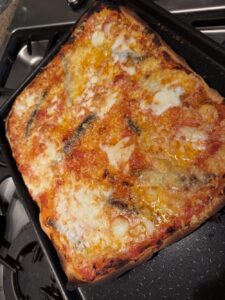 Spread the tomato sauce thin, do not pile it on, distribute 6 or 8 anchovies on top and bake for 6-7 minutes until edges are browned. Then add the cheese and bake again for 3-4 minutes.