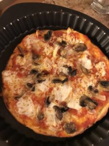 Adding the cheese after the pizza is on its way will keep the cheese from turning to rubber!