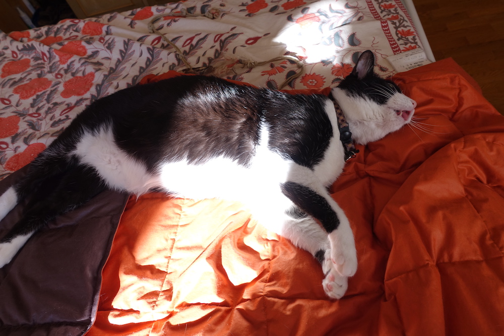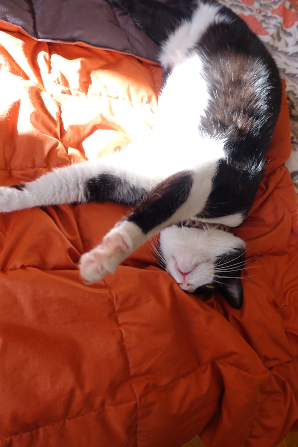 We’re sorry about Lola flying off to the Bridge – we’re always sorry to lose friends but know we will see them again one day. Meanwhile you look quite comfy enjoying a sunpuddle AND having a good stretch…..it’s nice to feel cozy at home isn’t it!