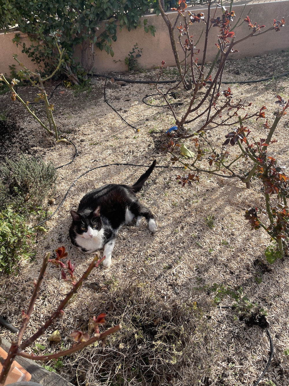 How nice of you to guard the bushes. Be sure to check on ground level for mice trying to chew on them too. XO
