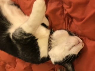 Well, today it was raining and he was at our door so mama let him in her office and closed the door to the rest of the house and fed him and dried him off and left the door to the outside open for him and eventually he left when the rain stopped and we hope he is at his own home and safe and dry. What a weird mama he has….