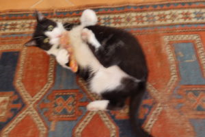 Does that ever happen in your house? Or how about this: You wake up (in hunt mode because you always wake up in hunt mode–read: hungry) and you play and play and play on bed with that weird feather-thing on the end of what looks like a fishing pole (whatever that is) and you dive and chase and stalk and make your fishing-pole-holder think you are having the time of your life but after exactly 8-10 minutes of this (when you hear your papa opening the door to the outside), your leap off the bed and disappear down the stairs, leaving your playmate holding the weird feather-thingy and laughing (her) head off at your graceful, elegant exit!