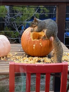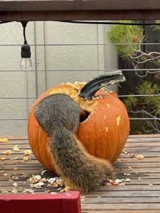 That squirrel sure is making a mess of that pumpkin!