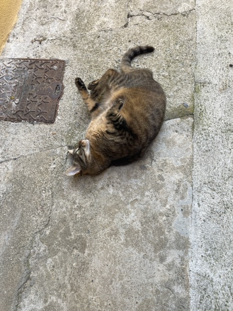 Mama takes little treats and tastes to one of our lovely older neighbors, labeling her a “guinea pig” for mama’s recipe-testing, and THIS KITTY is always rolling around and rubbing on mama’s leg and looking “too cute for words”, as mama puts it, and frankly. I AM DERANGED BY THIS! Ca me dérange beaucoup!